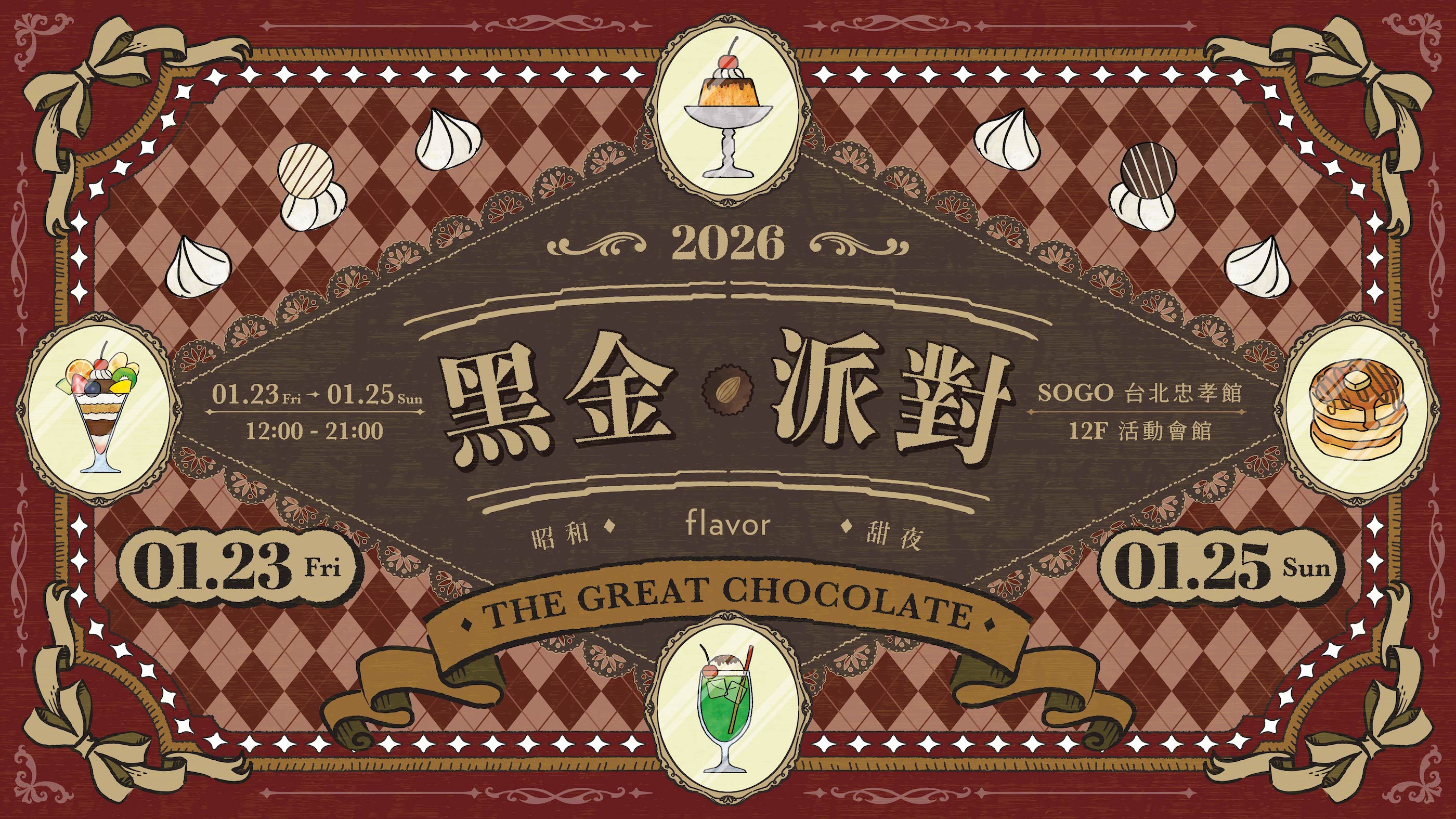 2026《黑金派對|昭和甜夜》將在 SOGO 台北忠孝館 12F 活動會館舉辦,延續集結最受巧克力迷熱愛的國內外巧克力、甜點、咖啡、酒飲品牌,共同推出多款結合巧克力與和洋風格的限定商品,
